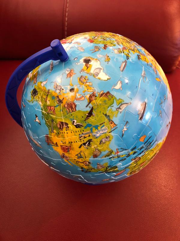 The ravensburger children's globe puzzleball is a spherical map of the world featuring drawings of native animals to specific land masses.